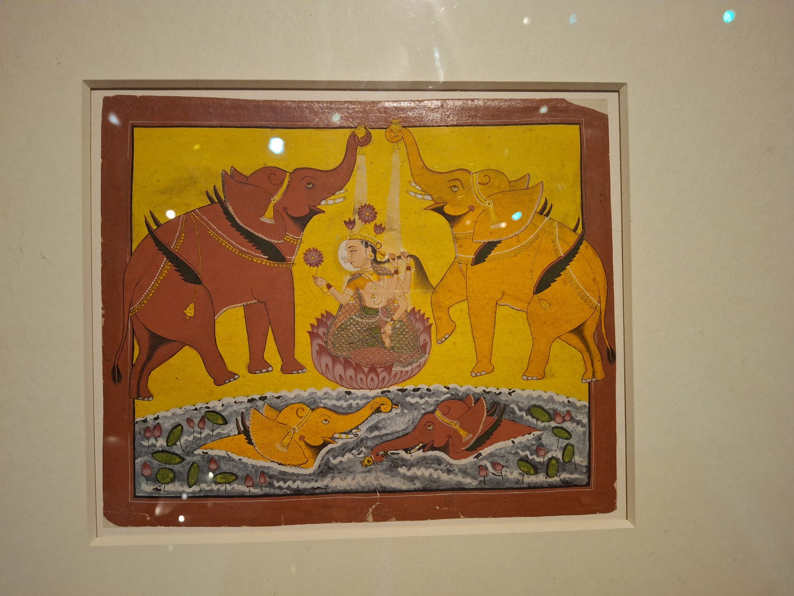 The goddess Lakshmi has yakshi origins and is one of the most popular deities in Hinduism, Buddhism and Jainism. There is a beautiful painting of her in the exhibition where she sits on a lotus blossom while elephants pour water over her. Their dark bodies symbolise monsoon clouds filled with rain, ready to bring the earth to life. Lakshmi is the goddess of good fortune and abundance, and this image successfully conveys that message.