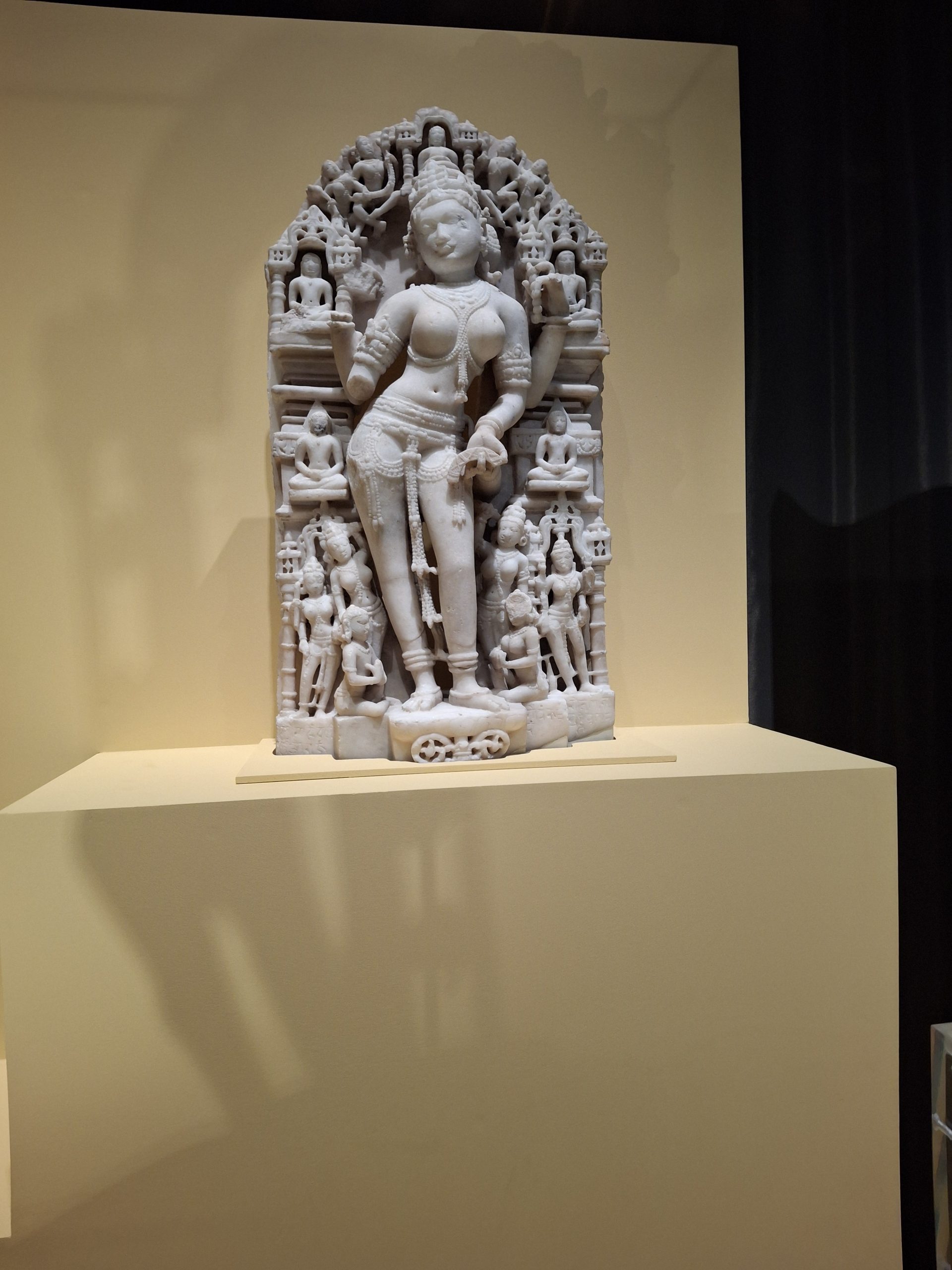 For Jain devotees the ultimate goal is to gain enlightenment; to help them there are sixteen goddesses of knowledge called Vidyadevis, usually depicted holding a manuscript and sometimes a pen.  Sarasvati is worshipped by Jains and Hindus as the personification and guardian of all knowledge and is also the guardian of the arts and music.