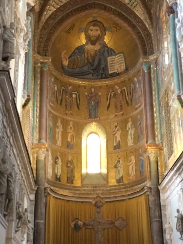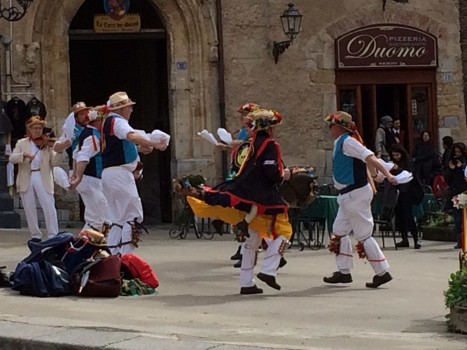 Belly laugh number two: a short train trip along the coast led us to Cefalu, with the Duomo’s stunning mosaics. Enjoying lunch in the sun (yes, sun, after days of greyness) what should appear but a troupe of Morris dancers who proceeded to trip the light fantastic before a crowd of bemused locals and tourists (see the video). Turns out this is a group of enthusiasts who each March take a trip to a different locale complete with straw hats, bells and wooden sticks. The only prerequisite is that Stansted has to be the point of departure.