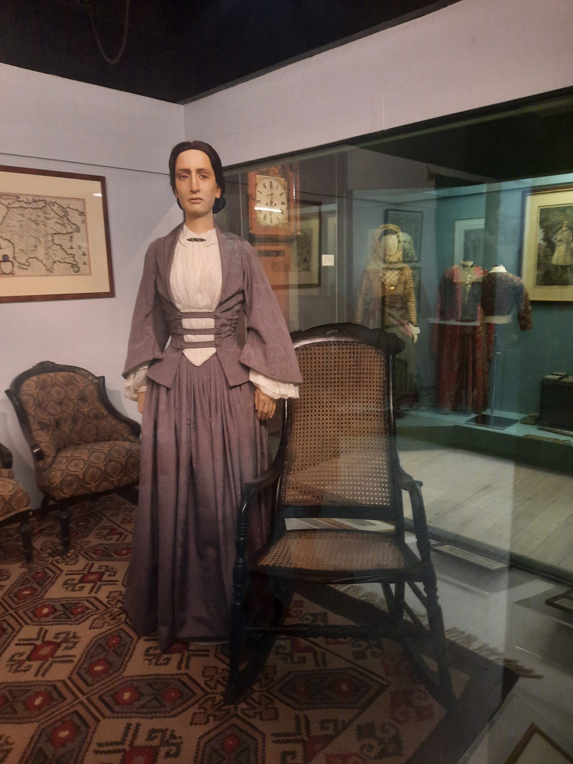 The folklore museum in Nafplion has a life size model of Kalliopi in her home dressed in the clothing of the time. There is also a monument to her in Syntagma Square in Nafplion. There is an entry in Wikipedia about her in Greek only, so if there are any Greek-speaking damesnet readers out there who fancy doing a spot of translation, let us know and we can try and get an English version uploaded too.