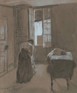 Gwen John was born in Wales in 1876, but most of her painting life was in France. Her mother Augusta was an amateur watercolourist and both parents encouraged the children’s interest in literature and art.  Augusta died when John was 8 years old, and the family moved to Tenby. John painted seaside pictures of gulls, shells and fish, and in 1895 left home to study at the Slade School of Art, at the time one of the few art schools that were accepting women on the same terms as men. John lived with her younger brother Augustus, who had enrolled at the Slade a year earlier.