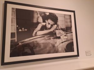 Jackie Kennedy, a young Queen Elizabeth, ‘Lady Bird’ Johnson and Grace Kelly gaze dispassionately from the walls of one of the rooms. Another features photos of African American students training in passive resistance tactics for school sit-ins and a party in Virginia in which white students are introduced to African American students.  An exhausted woman in a Harlem brothel leans up against the bar; her eyes are expressionless.