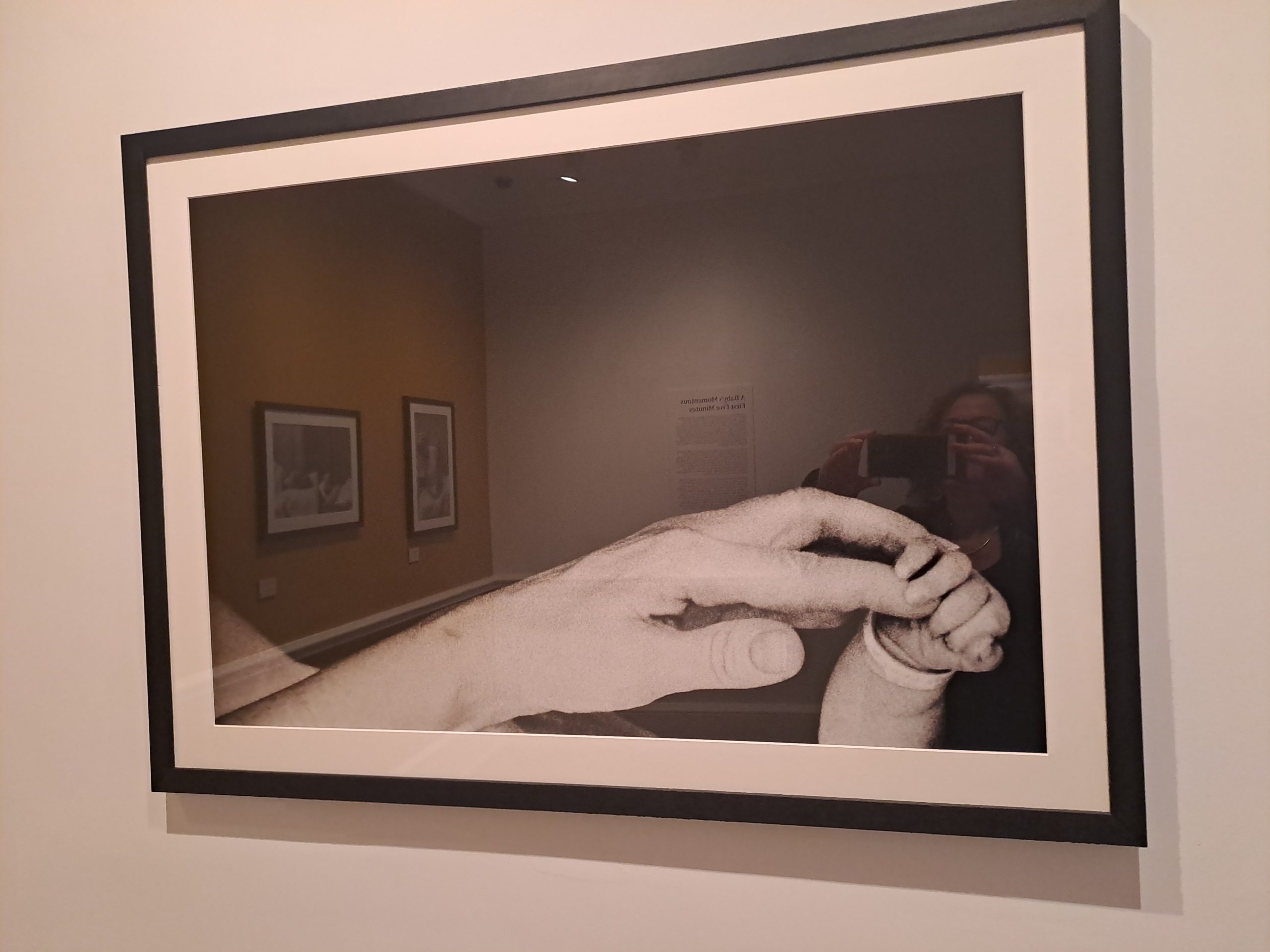 Childbirth is a theme that Arnold chose to photograph throughout her career, beginning with the birth of her niece Jane Walsh in 1952.  We do not see Jane’s face or her baby – just two legs mounted on birthing stirrups, with a male doctor and nurse standing facing them, apparently dispassionately. Other photos in this series reflect the maternal; a newborn finger clutching its mother’s finger, and a head shot of a mother gazing in joy at her swaddled baby.  The only visible evidence of the baby is a tiny heel projecting from a bundle. ‘Skin on skin’ was clearly not in vogue during 1950s childbirth.